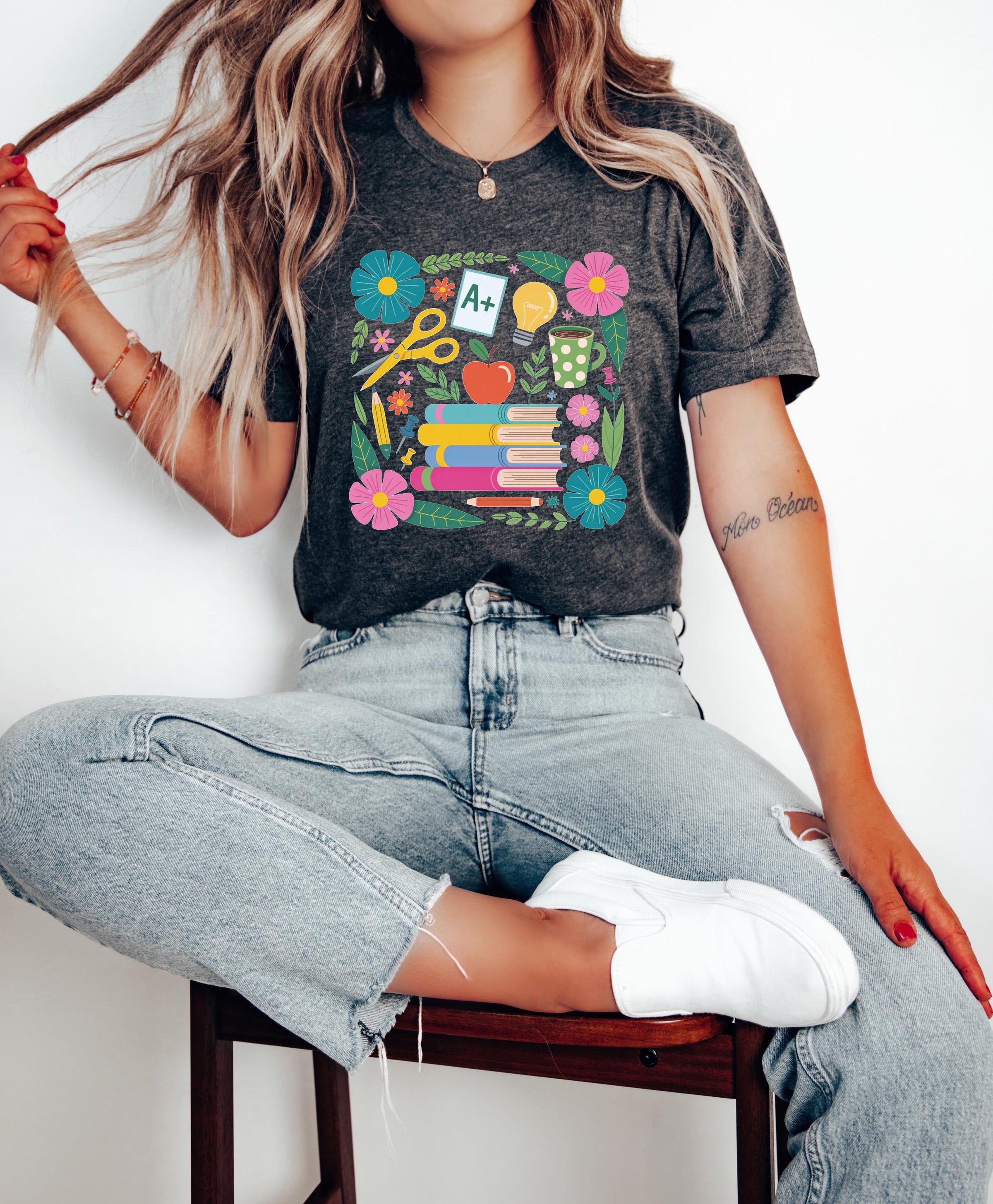 This teacher shirt is perfect for back to school, and any day of the year! The design features some of your favorite supplies from books to coffee to scissors with a cute floral border for a fun, whimsical look. Gift this to your favorite teacher, or to yourself for a cozy everyday tee!